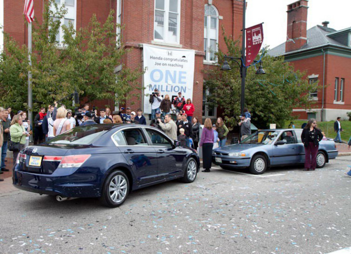 Στα της παρέλασης τώρα, ο Joe πίστευε πως θα παρευρισκόταν απλώς σε μια μικρή συνέντευξη τύπου με την ευκαιρία της συμπλήρωσης των 1.000.000 μιλίων, όταν είδε έκπληκτος εφτά άτομα μεταμφιεσμένα σε αριθμούς που σχημάτιζαν το νούμερο 1.000.000, διάφορα άρματα, cheerleaders, παιδιά που κρατούσαν σημαίες με την φωτογραφία του και ένα γιγάντιο κοντέρ να παρελαύνουν από μπροστά του, ένα αεροπλάνο να πετάει με μπάνερ συγχαρητηρίων και τη σχολική μπάντα να φροντίζει για τη μουσική επένδυση. Αποκορύφωμα της παρέλασης-έκπληξης για τον Joe ήταν η στιγμή που η ολίγον… “τσουπωτή” αλλά πολύ όμορφη Miss Maine του παρέδωσε το κλειδί ενός ολοκαίνουργιου Accord, προσφορά της American Honda, φυσικά. Τι άλλο να ευχηθούμε στον Joe εκτός από καλά επόμενα 1 εκατομμύριο μίλια…