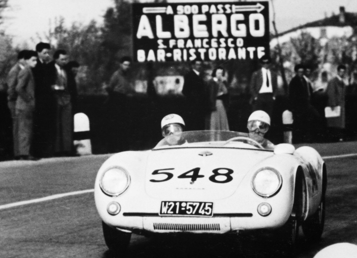 Η 550 Spyder το 1954 πέτυχε μάλλον το πιο εντυπωσιακό κατόρθωμα, καθώς ο εργοστασιακός οδηγός Hans Herrmann για να κερδίσει πολύτιμο χρόνο πέρασε με το χαμηλωμένο κεντρομήχανο σπορ αυτοκίνητό του κάτω από τις κατεβασμένες μπάρες μιας σιδηροδρομικής διάβασης, ακριβώς πριν περάσει από το σημείο ένα τρένο. Το δίδυμο Hermann/Linge ολοκλήρωσαν τον αγώνα με μια νίκη κατηγορίας, καταλαμβάνοντας την εντυπωσιακή έκτη θέση στη γενική κατάταξη.
