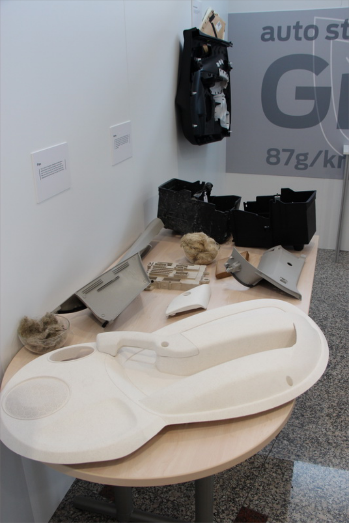 Ως προς τον άλλο τομέα, αυτόν της χρήσης ανανεώσιμων υλικών, ήδη ανανεώσιμες ίνες, όπως το κενάφ, το λινάρι, η κάνναβη και το ξύλο χρησιμοποιούνται ευρέως στα διακοσμητικά ένθετα θυρών και το νέο B-MAX της Ford είναι το πιο πρόσφατο χαρακτηριστικό παράδειγμα. Το 50% του υλικού στα διακοσμητικά ένθετα θυρών του νέου B-MAX που κατασκευάζονται με μία διαδικασία χύτευσης, προέρχεται από ίνες λιναριού. Ωστόσο, μία τεχνική χύτευσης μέσω ψεκασμού την οποία ξεκίνησε πρώτη η Ford χρησιμοποιώντας άχυρο σιταριού σε εξαρτήματα του εσωτερικού, εξετάζεται τώρα για προσθήκη σιζάλ (ένα φυτό που χρησιμοποιείται συχνά σε στόχους βελών, σχοινιά και χαλιά) ακόμα και κάνναβης. Η μέθοδος αυτή επιτρέπει την κατασκευή όλο και πιο περίπλοκων εξαρτημάτων όπως βάσεις μπαταριών και καλύμματα κινητήρων. Επιπλέον η Ford πετυχαίνει δύο ακόμα στόχους: μειώνει το βάρος του υλικού, ενώ οι θερμοκρασίες που απαιτούνται για την παραγωγή αυτών των εξαρτημάτων είναι 40 βαθμοί χαμηλότερες σε σχέση με τα πλαστικά εξαρτήματα.