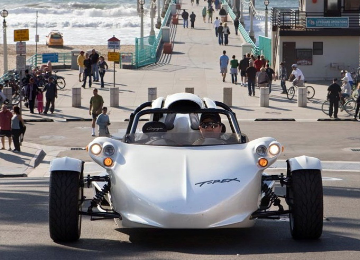 Αυτοκίνητο; Μοτοσυκλέτα; Ή μήπως… βάτραχος; Εεεε, ναι, δηλαδή, όχι. Βασικά, όχημα είναι, Καναδέζικο (!!), τρίτροχο, με δύο θέσεις σε διάταξη αυτοκινήτου, μοτέρ μοτοσυκλέτας, μπαγκαζιέρες αντί για πορτμπαγκάζ και εμφάνιση… δανεισμένη από το ζωικό βασίλειο. Πως είναι στο δρόμο; Όχι και τόσο green: Καμιά 200αριά άλογα φτάνουν στον πίσω τροχό, με την Campagna να ανακοινώνει μέση κατανάλωση λίγο κάτω από τα 10 lt/100 km – μοτέρ Harley είναι αυτό, με 1.400 κυβικά και 6άρι κιβώτιο, ικανά να εκτοξεύσουν το T-Rex στα 100 km/h από στάση σε 4 περίπου sec και να του δώσουν τελική – κρατιέσαι; – 230 km/h. Πάρε μια ιδέα στο παρακάτω video.