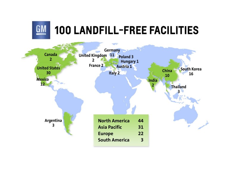 Ένα κέντρο διανομής (distribution center) στο Lansing (Michigan - ΗΠΑ) είναι η 100ή εγκατάστασή της General Motors μηδενικών αποβλήτων υγειονομικής ταφής (landfill-free). Όπως ανακοίνωσε η GM, καμία άλλη αυτοκινητοβιομηχανία δεν διαθέτει τέτοιο αριθμό εγκαταστάσεων μηδενικών αποβλήτων υγειονομικής ταφής, αυτή τη στιγμή. Η GM, σε πρώτη φάση, μειώνει τα απόβλητα (waste-reduction) και στη συνέχεια επικεντρώνεται στην ανακύκλωση και επαναχρησιμοποίησή τους. Το 2011, ο αμερικάνικος όμιλος (στον οποίο ανήκουν μάρκες όπως οι Opel, Chevrolet και Cadillac) ανακύκλωσε ή επαναχρησιμοποίησε 2,6 εκατομμύρια τόνους υλικών στα εργοστάσιά της σε όλο τον κόσμο. Αυτό αντιστοιχεί σε περισσότερα από 38 εκατομμύρια σακούλες σκουπιδιών, ή στην μηνιαία παραγωγή απορριμμάτων κάθε κατοίκου της Νέας Υόρκης!