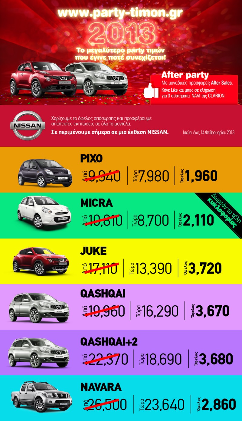 Συγκεκριμένα, το www.party-timon.gr της Nissan προσφέρει σε όλους μέχρι και τις 14 Φεβρουαρίου ΚΑΙ απίστευτες εκπτώσεις ΚΑΙ ΔΩΡΕΑΝ το όφελος της απόσυρσης, σε όλα τα μοντέλα της.