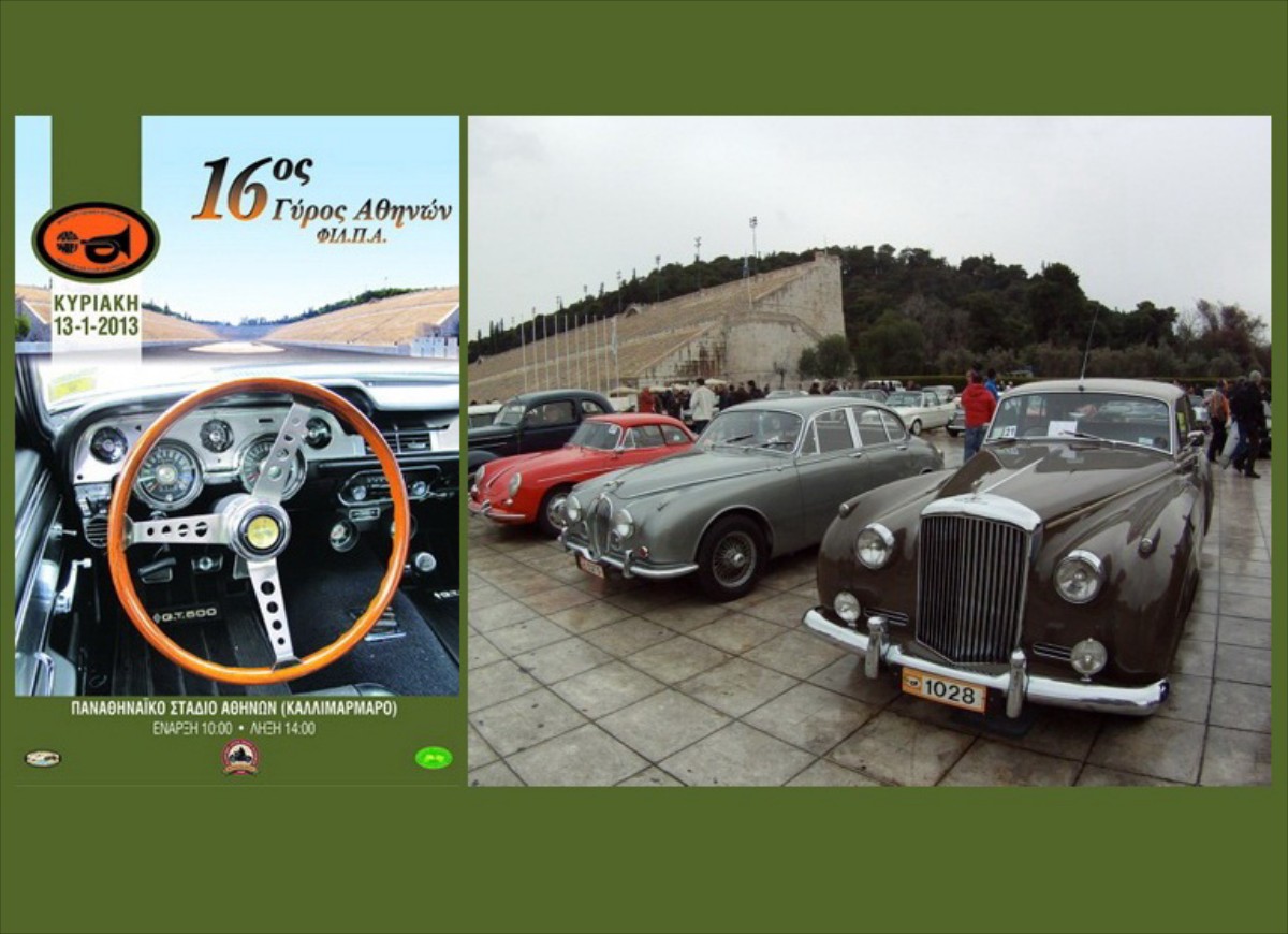 Η ΦΙΛΠΑ (Φίλοι του Παλαιού Αυτοκινήτου) διοργανώνει για 16η φορά την πρώτη πανηγυρική εκδήλωση Ιστορικών Οχημάτων (αυτοκίνητα, μοτοσυκλέτες & στρατιωτικά) της νέας χρονιάς. Η κλασική στατική εκδήλωση θα γίνει την Κυριακή 13 Ιανουαρίου 2013 στο Καλλιμάρμαρο Παναθηναϊκό Στάδιο, όπου από τις 09:00 το πρωί μέχρι τις 14:00 το μεσημέρι θα παραταχθούν αυτοκίνητα και μοτοσικλέτες κατασκευασμένα μέχρι και το τέλος του έτους 1975. Μετά το πέρας της εκδήλωσης, εθελοντικά για όσους από τους συμμετέχοντες επιθυμούν, θα πραγματοποιηθεί βόλτα μέχρι την παραλιακή της Βούλας, με τερματισμό στο Parking του Vive Mar για μεζέδες και κρασάκι. Μέρος του ποσού που θα συγκεντρωθεί από τις συμμετοχές θα διατεθεί σαν φιλανθρωπική ενίσχυση της ΦΙΛΠΑ προς το Κέντρο Ειδικών Ατόμων "ΧΑΡΑ". Περισσότερες πληροφορίες στη διοργανώτρια Λέσχη ΦΙΛΠΑ, οδός Κυβέλης 6, 153 44 Γέρακας, τηλ. 210 65 34 700., φαξ 210 6533420, email info@philpa.gr, καθώς και στις ιστοσελίδες: www.philpa.gr και www.facebook.com/Philpa.gr.
