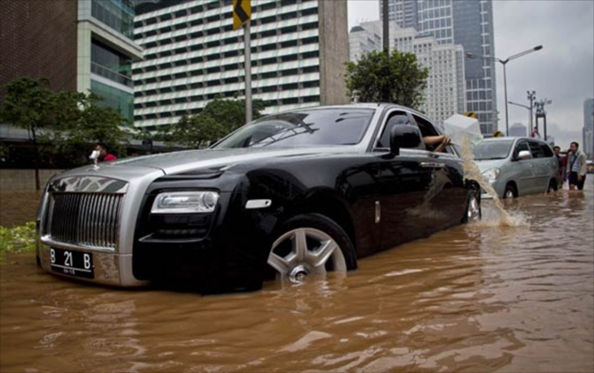 Η Ινδονησία πλήττεται συχνά από καταστροφικές πλημμύρες και οι πρόσφατες βροχοπτώσεις προκάλεσαν αρκετούς θανάτους και περισσότερους από 20.000 αστέγους. Στις παράπλευρες απώλειες τα οχήματα που βρέθηκαν στους δρόμους και παρασύρθηκαν από τα ορμητικά ποτάμια. Μεταξύ αυτών και μία Rolls Royce Ghost η οποία βρέθηκε μέχρι τα παράθυρα μέσα στο νερό. Ο ιδιοκτήτης ζήτησε βοήθεια για να ρυμουλκηθεί σε ασφαλές μέρος το αυτοκίνητο και ο σοφέρ ανάλαβε να το ελαφρώσει λίγο αδειάζοντας με κουβά το εσωτερικό. Η Ghost αξίας ενός εκατομμυρίου ευρώ υπέστη ζημιά πολλών χιλιάδων ευρώ αλλά πιθανότατα θα συνέλθει αφού θα «γδυθεί» ώστε να στεγνώσει κάθε της σημείο.