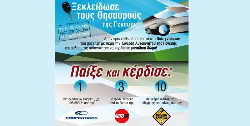 Ένα σετ ελαστικών Cooper CS2, προσφορά της Agripan ΑΕ, 3 δωρεάν service αυτοκινήτου από το δίκτυο της AutoFit και 10 σεμινάρια οικονομικής οδήγησης από το Driving Academy, μπορείς να κερδίσεις στο μεγάλο διαγωνισμό “Ξεκλείδωσε τους θησαυρούς της Γενεύης!”, που διοργανώνει το gocar.gr με αφορμή την διεθνή έκθεση αυτοκινήτου της Γενεύης 5-17 Μαρτίου. Στο διαγωνισμό - quiz γνώσεων, κάθε πρωί και σε όλη την διάρκεια της έκθεσης θα ανεβαίνει μία φωτογραφία με μία λεπτομέρεια ενός αυτοκινήτου (π.χ. φανάρι, ταμπλό κλπ) ή μια ερώτηση σχετικά με τα νέα μοντέλα που παρουσιάζονται εκεί. Οι συμμετέχοντες στο διαγωνισμό θα πρέπει να επιλέξουν την σωστή απάντηση ανάμεσα σε 3 επιλογές (multiple choice). Κάθε σωστή απάντηση -μία την ημέρα- θα προσμετρά ως μια επιπλέον συμμετοχή στην κλήρωση - όσες περισσότερες σωστές απαντήσεις έχει κάποιος τόσες περισσότερες συμμετοχές στην κλήρωση, άρα και πιθανότητες για να κερδίσει ένα από τα μοναδικά δώρα.