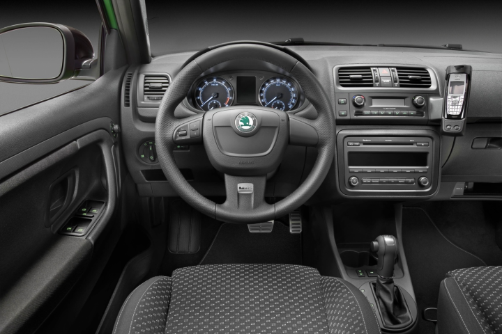 O εμπρός προφυλακτήρας έχει σπορ σχεδίαση, με ενσωματωμένους προβολείς ομίχλης που συνδυάζονται με σύστημα δυναμικής γωνιακής κλίσης (corner system) και με φώτα ημέρας τεχνολογίας LED. Σε σχέση με τις υπόλοιπες εκδόσεις Fabia, ξεχωρίζει χάρη στις ζάντες αλουμινίου 17'' που έχουν σχεδιαστεί ειδικά για την RS, τις κόκκινες δαγκάνες των φρένων, τα φιμέ τζάμια, τον νέο πίσω προφυλακτήρα με ενσωματωμένο διαχύτη αέρα (diffuser) και τη διπλή εξάτμιση. Ανάλογά με το χρώμα του αμαξώματος, η οροφή, το σπόιλερ οροφής καθώς και οι ζάντες αλουμινίου θα διατίθενται σε τρεις διαφορετικούς χρωματισμούς: μαύρο, άσπρο και ασημί. Η Fabia RS θα διατίθεται με σπορ μπάκετ καθίσματα με τα λογότυπα RS, σπορ δερμάτινο τριάκτινο τιμόνι, πεντάλ αλουμινίου και σπορ πίνακα οργάνων. Προαιρετικά θα διατίθεται και με χειριστήρια ( paddles ) στο τιμόνι για τις αλλαγές ταχυτήτων στο αποκλειστικά 7άρι αυτόματο κιβώτιο DSG.