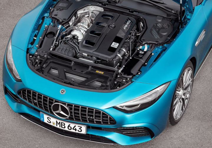 Η νέα Mercedes-AMG SL 43 κινείται από τον M139 κινητήρα της AMG των 2.0 λίτρων. Το e-turbo που χρησιμοποιεί καταφέρνει να αποδίδει ακόμη και αν οι στροφές του μοτέρ βρίσκονται χαμηλά. Ένα παραδοσιακό μειονέκτημα των υπερτροφοδοτούμενων κινητήρων με turbo είναι ότι στις χαμηλές rpm η τουρμπίνα δεν έχει την απαραίτητη κίνηση για να προσφέρει έξτρα ισχύ, αφού αυτή κινείται από τα καυσαέρια. Με το e-turbo, ένα ήπια υβριδικό σύστημα των 48V συνδέεται με την τουρμπίνα και την κινεί ακόμη και αν τα καυσαέρια είναι λίγα. Έτσι λοιπόν η δύναμη που λαμβάνει ο οδηγός έρχεται από τα χαμηλότερα στρώματα του στροφόμετρου.