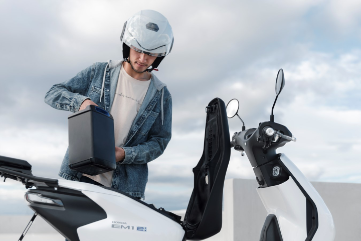 Μια μόνο φόρτιση προσφέρει ωφέλιμη αυτονομία 41,3 km, ή περίπου 48,0 km στη λειτουργία ECON σύμφωνα με τις συνθήκες εσωτερικών δοκιμών της Honda (30 km σε συνθήκες δοκιμών WMTC Class 1), ενώ το Honda Mobile Power Pack e: είναι σχεδιασμένο να αντέχει σε ποικίλες θερμοκρασίες, επίπεδα υγρασίας, χτυπήματα και κραδασμούς. Όπως υποδηλώνει και το όνομά του, το Honda Mobile Power Pack e είναι μια μπαταρία που μπορεί εύκολα να αφαιρεθεί από το EM1 e: για άνετη φόρτιση στο σπίτι. Η λειτουργία είναι απλή: ο φορτιστής με ενσωματωμένο ανεμιστήρα ψύξης, αντλεί ενέργεια από μια μονοφασική οικιακή παροχή AC 100-240 V και παράγει 270W το μέγιστο.