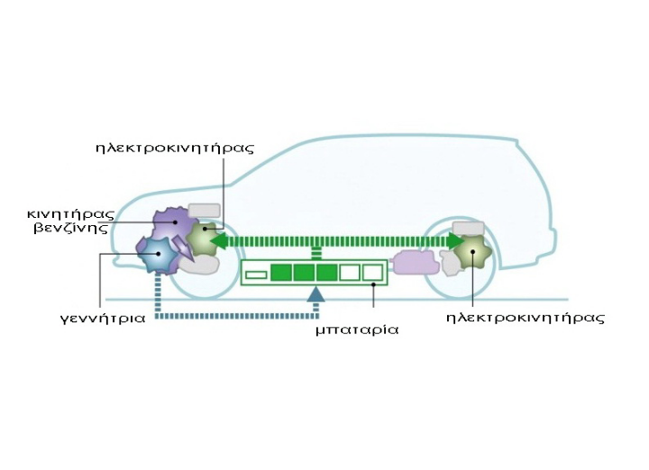 - Parallel: κίνηση με τους δύο ηλεκτροκινητήρες, με την παράλληλη συμβολή του κινητήρα βενζίνης.
