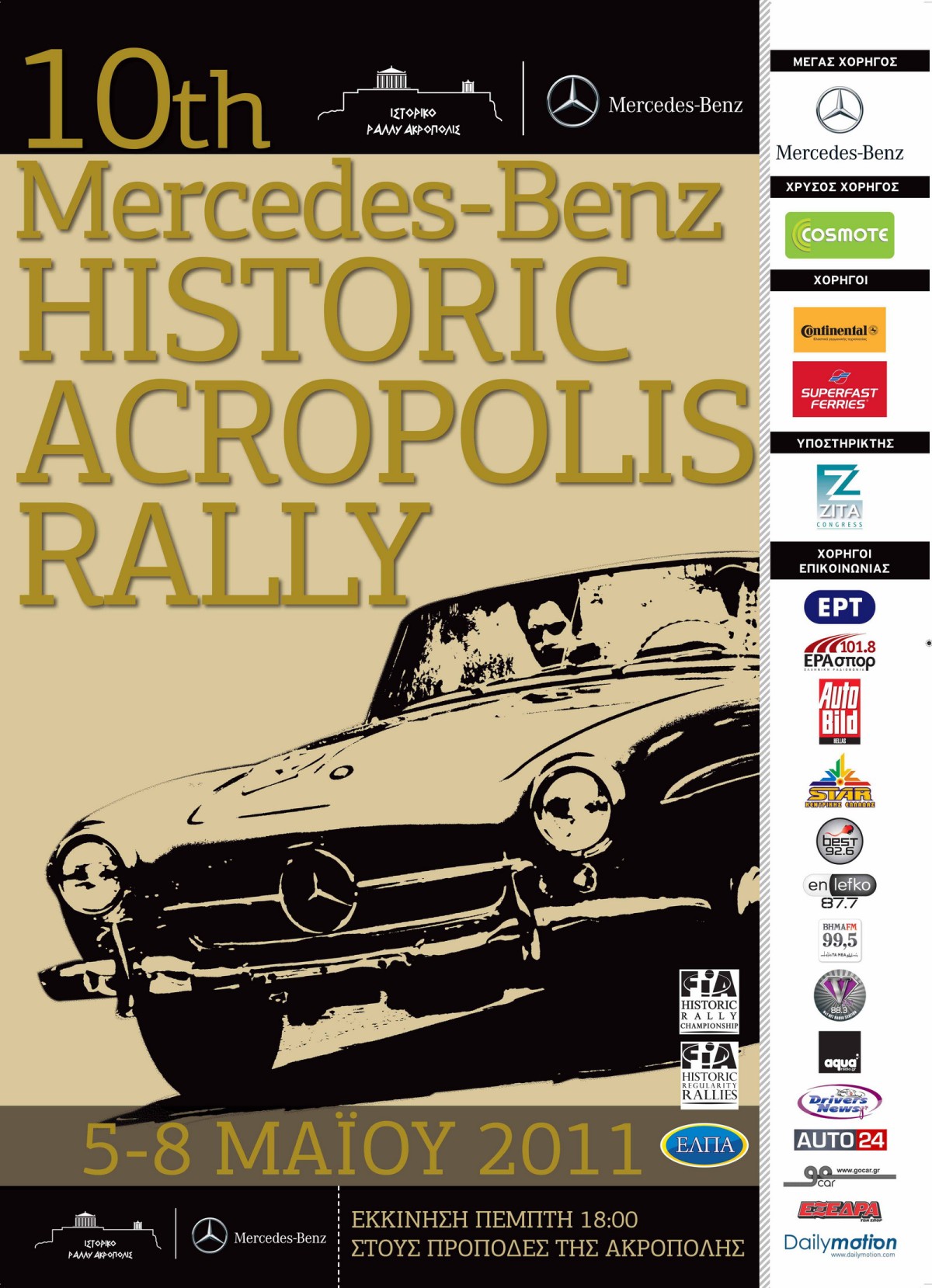 Την Πέμπτη 5 Μαΐου στις 18:00 γίνεται η έναρξη του 10ου Mercedes-Benz Ιστορικού Ράλλυ Ακρόπολις. 161 ιστορικά αυτοκίνητα, άλλα κατάλληλα προετοιμασμένα για τη μάχη με το χρονόμετρο και άλλα, έργα τέχνης περασμένων δεκαετιών έτοιμα για ασκήσεις ακριβείας, εκκινούν κάτω από την Ακρόπολη δίνοντας ένα μοναδικό θέαμα για όσους παρακολουθήσουν την εκκίνηση από κοντά. Ο αγώνας διεξάγεται από τις 5 μέχρι και τις 8 Μαΐου στη Στερεά Ελλάδα και πιο αυγκεκριμένα στην Αττική, τη Βοιωτία και την Φθιώτιδα, με επίκεντρο τα Καμένα Βούρλα. Μια τριήμερη μάχη 920 χιλιομέτρων με 19 ειδικές διαδρομές για 63 αυτοκίνητα στην κατηγορία Sporting και 98 στη Regularity. Το 10ο Ιστορικό Ράλλυ Ακρόπολις προσμετρά στο Ευρωπαϊκό Πρωτάθλημα Ράλλυ και στο Ευρωπαϊκό Έπαθλο Regularity Ιστορικών Αυτοκινήτων της FIA. Παράλληλα, αποτελεί τον δεύτερο γύρο του Πανελλήνιου Πρωταθλήματος Ιστορικών Αυτοκινήτων Regularity, καθώς και τον 4ο, 5ο και 6ο γύρο του Πανελλήνιου Πρωταθλήματος Ράλι Ιστορικών Αυτοκινήτων Sporting.