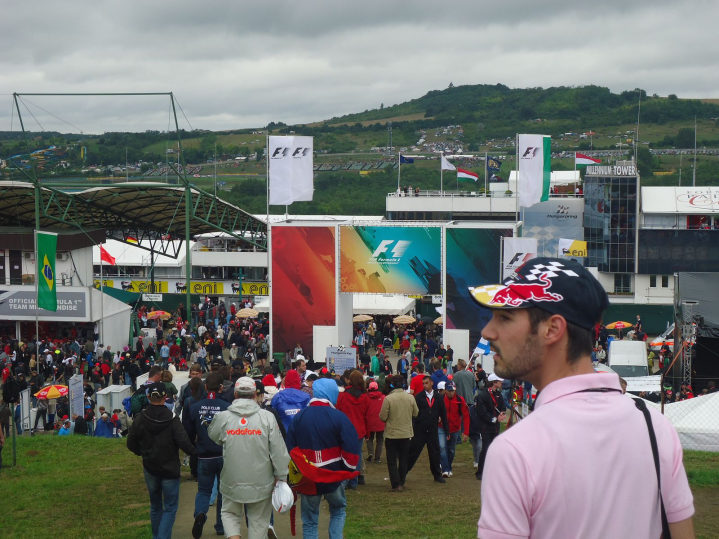 Πίσω από τις κερκίδες υπήρχαν τα κλασσικά περίπτερα που πουλούσαν είδη για F1 αλλά και αυτά που πουλούσαν γρήγορο φαγητό. Μπορεί να υπήρχε η ένδειξη “Greek Gyros”, αλλά όσοι το δοκίμασαν είπαν «μακριά». Μπήκα στην κερκίδα και περίμενα να ακούσω τα μονοθέσια να βάζουν μπρος τις μηχανές τους, όπως και έγινε. Ο καιρός ήταν περίεργος για τέλος Ιουλίου. Δροσερός και βροχερός. Ευτυχώς όμως δεν είχαμε εκκίνηση πίσω από αυτοκίνητο ασφαλείας. Από τα αξιοσημείωτα που δεν βλέπει κάποιος από την τηλεόραση είναι ο αγώνας δρόμου που κάνουν οι μηχανικοί για να επιστρέψουν από την πίστα στα γκαράζ. Όταν τα μονοθέσια φεύγουν για τον γύρο σχηματισμού, οι μηχανικοί πρέπει να γυρίσουν πίσω στα γκαράζ.