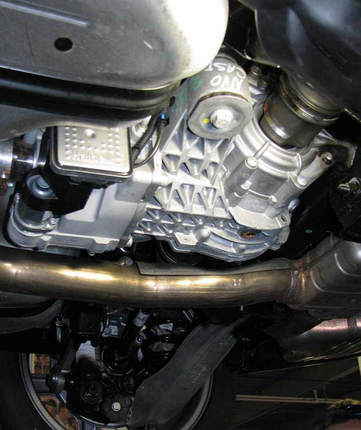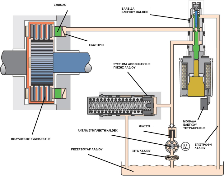 Ο συμπλέκτης Haldex εδράζεται εμπρός από το πίσω διαφορικό, με βασικό σκοπό την εμπλοκή του πίσω άξονα όταν υπάρχει απώλεια πρόσφυσης από τους μπροστινούς τροχούς. Ο Haldex αποτελείται από μια υδραυλική αντλία πίεσης λαδιού, που διαθέτει ένα δακτυλιοειδές έμβολο από τη μια μεριά πλευρά κι ένα κινούμενο έμβολο από την άλλη. Μέσα στο κέλυφος κι ανάμεσα στα δύο αυτά μέρη βρίσκεται ένας πολύδισκος συμπλέκτης. Υπό κανονικές συνθήκες όπου οι δύο άξονες εμπρός και πίσω περιστρέφονται με την ίδια ταχύτητα η αντλία δε λειτουργεί και η ροπή μεταφέρεται κατά βάση στον εμπρός άξονα.