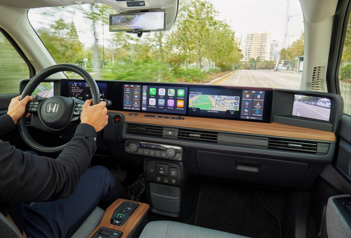 Μικρό, ηλεκτρικό και ευέλικτο, το Honda e «τα σπάει» σε εμφάνιση. Η πιο εντυπωσιακή εικόνα όμως βρίσκεται στο εσωτερικό. Το ταμπλό είναι… οθόνη από άκρη σε άκρη! Υπάρχει ο ψηφιακός πίνακας οργάνων, δύο οθόνες για το σύστημα πολυμέσων και τις λειτουργίες του αυτοκινήτου που μπορούν να ρυθμιστούν όπως θέλει ο οδηγός, αλλά και δύο ακόμη οθόνες σε ρόλο εξωτερικού καθρέπτη. Σωστά, δεν υπάρχουν καθρέπτες, μόνο κάμερες!
