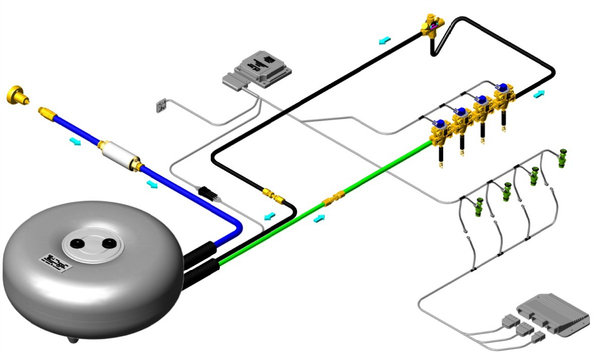 Από τη δεξαμενή το υγραέριο οδηγείται με σωλήνες πιέσεως απευθείας τα μπεκ και η πλεονάζουσα ποσότητα επιστρέφει μέσω ρυθμιστικής βαλβίδας πιέσεως πίσω στη δεξαμενή. Ο εγκέφαλος φροντίζει για το σωστό χρονισμό του ψεκασμού λαμβάνοντας σήμα από τα μπεκ βενζίνης.
