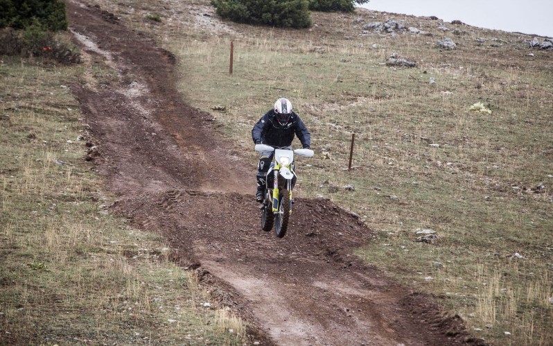 Πίσω στον εντουράδικο ψυχρό και βροχερό καιρό και στη στιγμή της αλήθειας. Το έδαφος μας υποδέχτηκε όπως πρέπει, νωπό κατά βάση και αφράτο στο σύνολο της πίστας που είχε στηθεί στο οροπέδιο. Ένας ισορροπημένος συνδυασμός γρήγορων και τεχνικών κομματιών με ανηφόρες, αλματάκια κατηφόρες και υποψία μονοπατιού, στοιχεία που αναζητάς τόσο με enduro όσο και με motocross. Τα ορατά απομεινάρια του λυσσαλέου βοριά είναι κάτι ανεμίζουσες κορδέλες που θα οριοθετούσαν τη διαδρομή. Όχι παντού αλλά σε ένα μεγάλο τμήμα της. Μικρό το κακό, θα σκαφτεί άλλωστε και τα ίχνη θα μας οδηγούν. Για να γίνει αυτό ο τεχνικός διευθυντής στην Ελλάδα, Κώστας Καλατζόπουλος ανάλαβε σε ρόλο πλοηγού και …σκαπανέα! Στο γενικό πρόσταγμα ο Sales & Marketing Manager Αργύρης Παπαγιαννακόπουλος έπαιζε πετυχημένα tetris με ανθρώπους και μηχανές, ώστε όλοι να οδηγήσουν όλα και να μην κάνει κοιλιά το πρόγραμμα στον διαθέσιμο σφιχτό πλέον χρόνο.