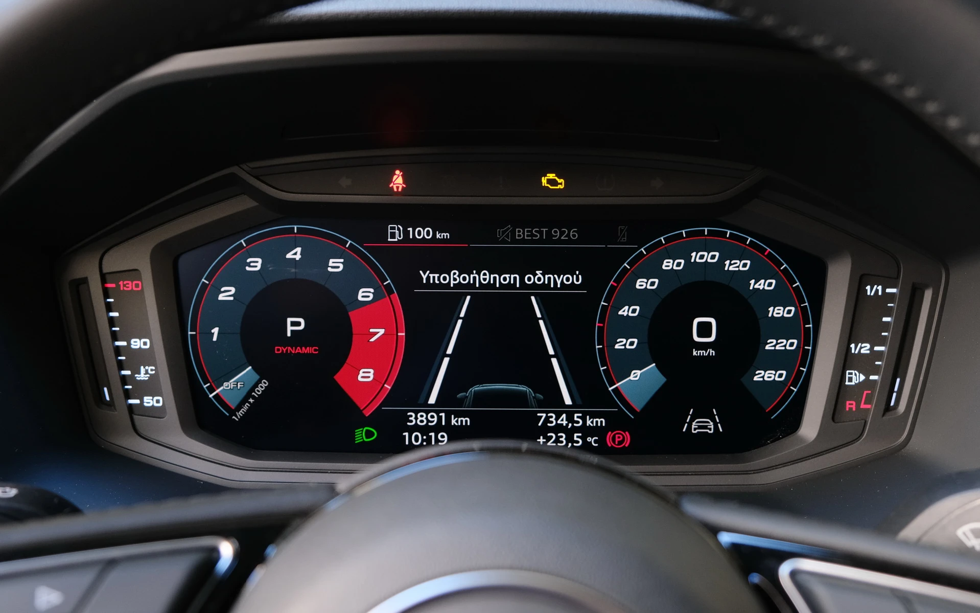 Οι χώροι είναι επίσης δευτερεύων παράγοντας επιλογής του γρήγορου Α1. Παρόλα αυτά, τέσσερις ενήλικες θα βολευτούν με μικρές παραχωρήσεις στο αποκλειστικά πεντάθυρο σουπερμίνι, ενώ και ο χώρος αποσκευών ικανοποιεί με τον όγκο των 335 lt. Η ουσία σε αυτήν εδώ την έκδοση βρίσκεται στην εμπρός αριστερή θέση και στην αίσθηση που αυτή σου δίνει. Η γενική εικόνα και σαφέστατα ένα μίγμα sport και premium, με στοιχεία όπως η στραμμένη προς τον οδηγό κεντρική κονσόλα, η προσεγμένη ποιότητα υλικών στο επάνω μέρος του ταμπλό, ο ατμοσφαιρικός φωτισμός και ο εντυπωσιακός ψηφιακός πίνακας οργάνων των 10,25 ιντσών. Με μικρή χρέωση (170 € περίπου) αποκτά τον Virtual Cockpit των 12,5’’ του αυτοκινήτου της δοκιμής μας, το οποίο είχε επίσης τη μεγαλύτερη οθόνη των 10,1’’ στη θέση του στάνταρ infotainment με οθόνη αφής 8,8’’ για να προσφέρει συνδεσιμότητα, ενημέρωση, πλοήγηση και ψυχαγωγία. Προαιρετικά είναι και τα δερμάτινα τύπου μπάκετ καθίσματα που διακρίνονται για τη σωστή στήριξη του σώματος. Ο αυτόματος διζωνικός κλιματισμός και οι αισθητήρες φωτός και βροχής από την άλλη είναι στάνταρ, όπως και ένα πλήρες πακέτο συστημάτων υποβοήθησης του οδηγού με: