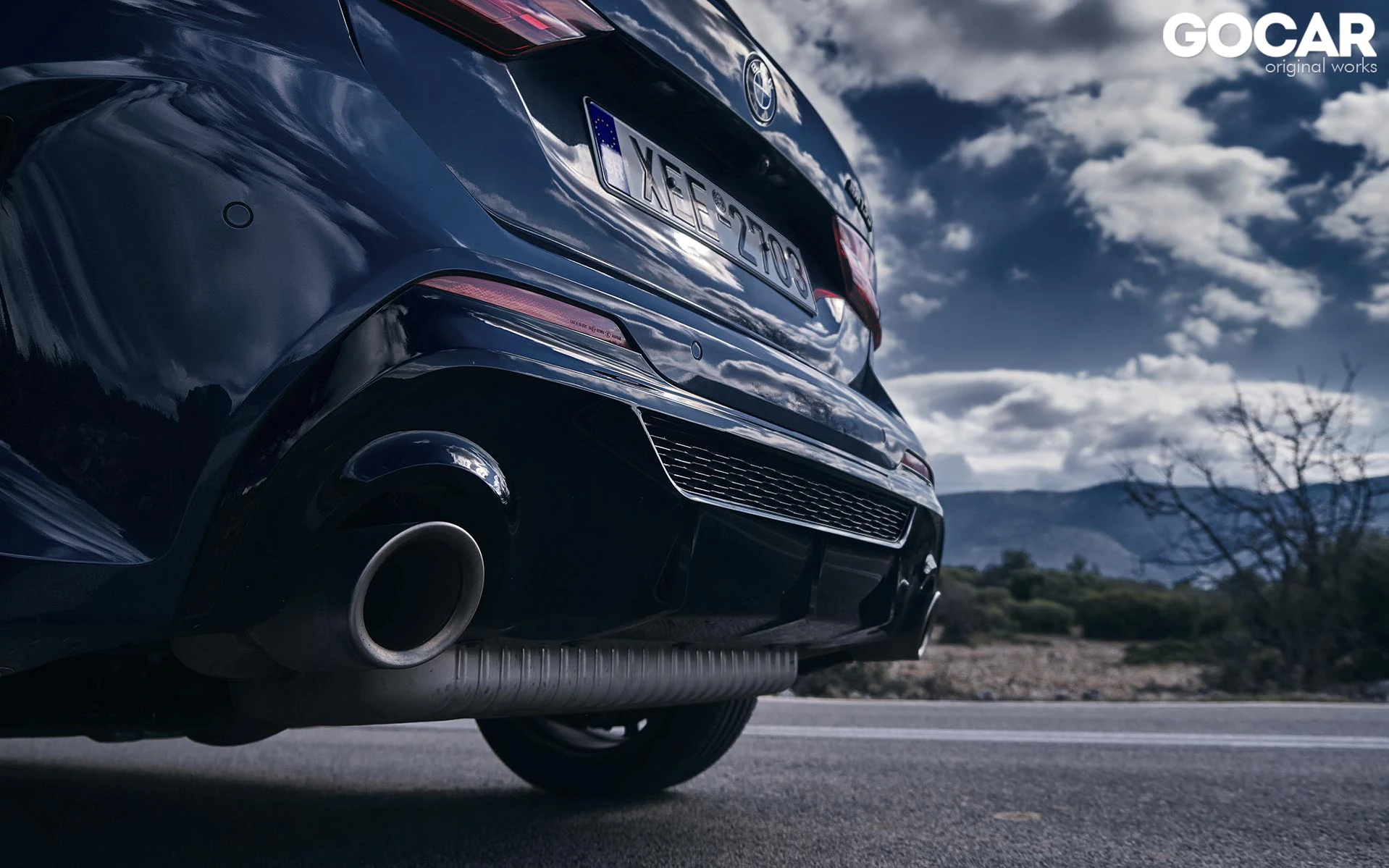Κοιτάζοντας πότε την ουρά του SQ2 και πότε την ογκώδη μάσκα του με τις οκτώ κάθετες μπάρες να γεμίζει τον καθρέφτη της M135i, είναι δύσκολο να το ξεχωρίσεις από ένα κλασικό σπορ hatchback. Οι έντονες ακμές στα πλευρά, ο πίσω προφυλακτήρας με τον διαχύτη και τις διπλές εξατμίσεις και οι μεγάλες ζάντες που γεμίζουν πειστικά τους τονισμένους θόλους δίνουν την εντύπωση ενός αυτοκινήτου με δυναμικό εκτόπισμα. Και δεν αφήνουν το μάτι να παρατηρήσει την (πολύ λίγο, έτσι κι αλλιώς) αυξημένη απόσταση από το έδαφος. Υπαινίσσεται τις προδιαγραφές του με έναν διακριτικό και καλόγουστο τρόπο. Όπως το κάνει και η BMW. Η μάσκα ενσωματώνει τα μεγάλα νεφρά, στο πρότυπο των μεγαλύτερων μοντέλων, όπως επιβάλλει η σχεδιαστική γλώσσα της μάρκας αυτή την εποχή. Σε συνδυασμό με έναν «αγριωπό» προφυλακτήρα, με ένα ευδιάκριτο splitter και μεγάλο κεντρικό αεραγωγό. Στο πίσω μέρος, η ελαφρώς ανασηκωμένη αεροτομή στην κορυφή της πέμπτης πόρτας και ο προφυλακτήρας με το diffuser και τις φαλτσοκομμένες εξατμίσεις διαμέτρου 10 cm είναι αρκετά Μ ώστε η εμφάνιση να δικαιολογεί το βαρύ σήμα.
