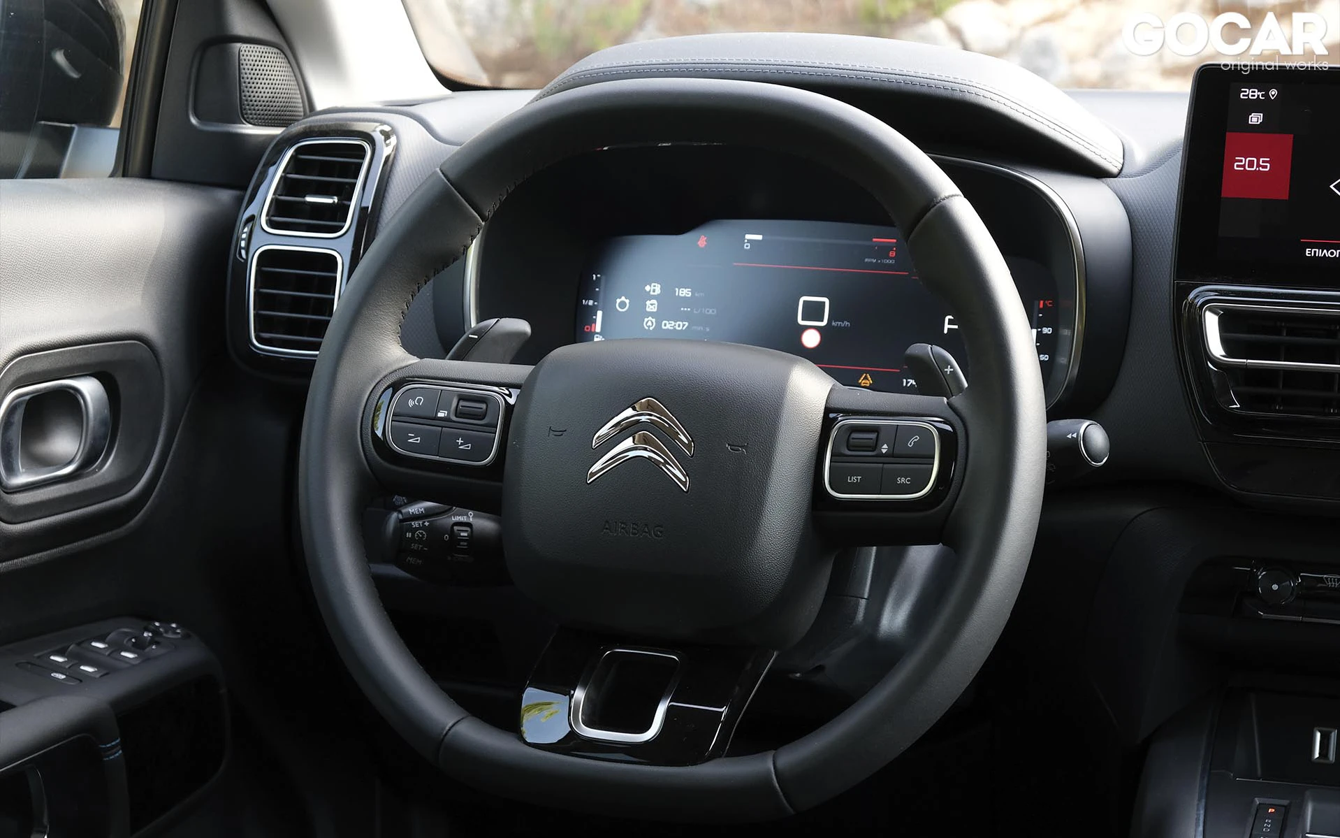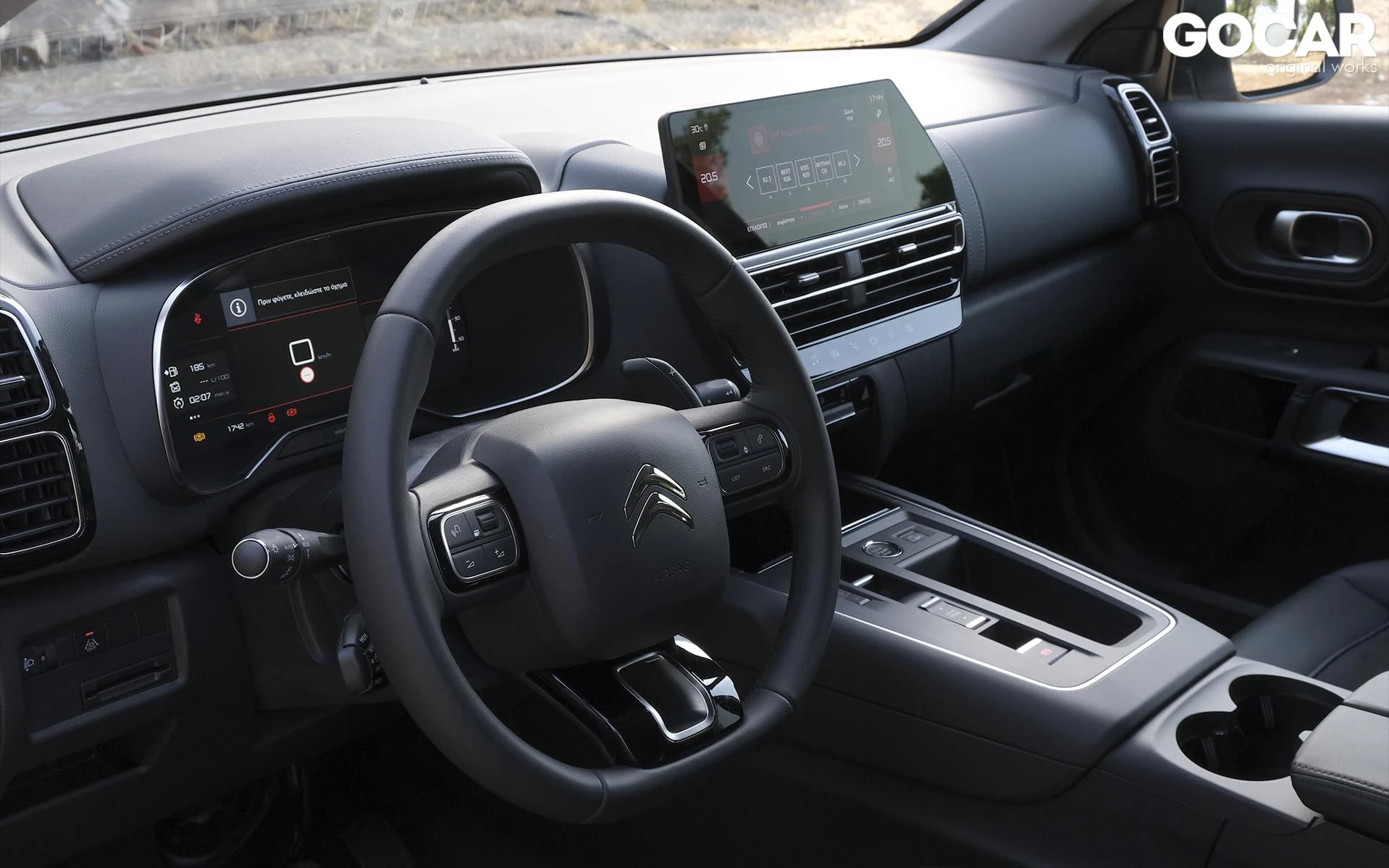 Η καμπίνα των επιβατών αποτελεί ένα από τα ισχυρά όπλα στη φαρέτρα του C5 Aircross. Στη Citroen φρόντισαν να βελτιώσουν την εμπειρία της διαβίωσης στο εσωτερικό του γαλλικού SUV με μία σειρά από σημαντικές και ουσιαστικές αλλαγές. Η πλέον εμφανής εντοπίζεται στην κεντρική κονσόλα, και συγκεκριμένα στη νέα οθόνη αφής των 10’’. Είναι αντίστοιχη με αυτή που εφοδιάζει τα νεότερα μοντέλα της εταιρείας και πλέον δεν είναι τοποθετημένη στην κονσόλα, αλλά αιωρούμενη. Πιο κάτω συναντάμε κουμπιά αφής για βασικές λειτουργίες, αλλά και φυσικούς διακόπτες, για τη ρύθμιση του κλιματισμού. Ο επιλογέας έχει αντικατασταθεί από έναν μικρό διακόπτη, επιλογή που συναντάμε πλέον στα περισσότερα μοντέλα του Group, ενώ εξακολουθούν να υφίστανται μία σειρά από πρακτικές θήκες. Νέα εμφάνιση έχει ο ψηφιακός πίνακας οργάνων των 12,3’’, ο οποίος εξακολουθεί να παραμένει ευχάριστος και με σωστή απεικόνιση των περισσοτέρων σημαντικών ενδείξεων. Η ποιότητα κατασκευής είναι πολύ καλή, με συνδυασμό σκληρών και μαλακών πλαστικών, ενώ υπάρχουν μερικά πολύ μικρά εργονομικά θέματα… Όσον αφορά τα συστήματα άνεσης και συνδεσιμότητας, το C5 Aircross προσφέρει και με το παραπάνω ό,τι προτάσσει η σημερινή εποχή.