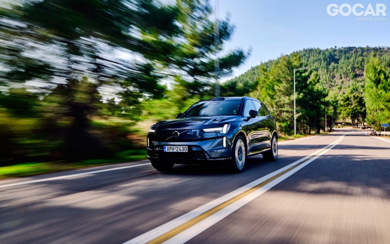 Επιστρέφοντας στα οδικά χαρακτηριστικά του Volvo EX90, η αερανάρτηση (διπλά ψαλίδια εμπρός, πολλαπλοί σύνδεσμοι πίσω) είναι μαλακή, χωρίς να σφίγγει αισθητά στο δυναμικό πρόγραμμα οδήγησης. Ως αποτέλεσμα, το βαρύ SUV με το βάρος των 2,8 τόνων, όπως λέμε και παραπάνω, αναπτύσσει κλίσεις στις στροφές. Γενικότερα, στη γρήγορη οδήγηση δείχνει -και είναι- έξω από τα νερά του. Με 517 PS στο δεξί πεντάλ, μαζεύει πάρα πολύ γρήγορα χιλιόμετρα αν το επιδιώξει ο οδηγός, ωστόσο τα φρένα θα σταθούν στο ύψος των περιστάσεων και δεν προκαλούν ανασφάλεια. Αν φτάσει στο όριό του, το EX90 θα γλιστρήσει ελεγχόμενα και όχι τόσο άτσαλα όσο προϊδεάζει το μεγάλο βάρος και το πολύ (μεγάλης διάστασης) λάστιχο. Τα ηλεκτρονικά συστήματα βέβαια, πολύ γρήγορα θα αντιδράσουν και θα επαναφέρουν τα πράγματα σε τάξη, όπως αρμόζει σε ένα SUV αυτής της κατηγορίας. Είπαμε! Εδώ, σημασία έχει η άνεση και οι ξεκούραστες μετακινήσεις. Και σε αυτούς τους τομείς, το EX90 διαπρέπει.