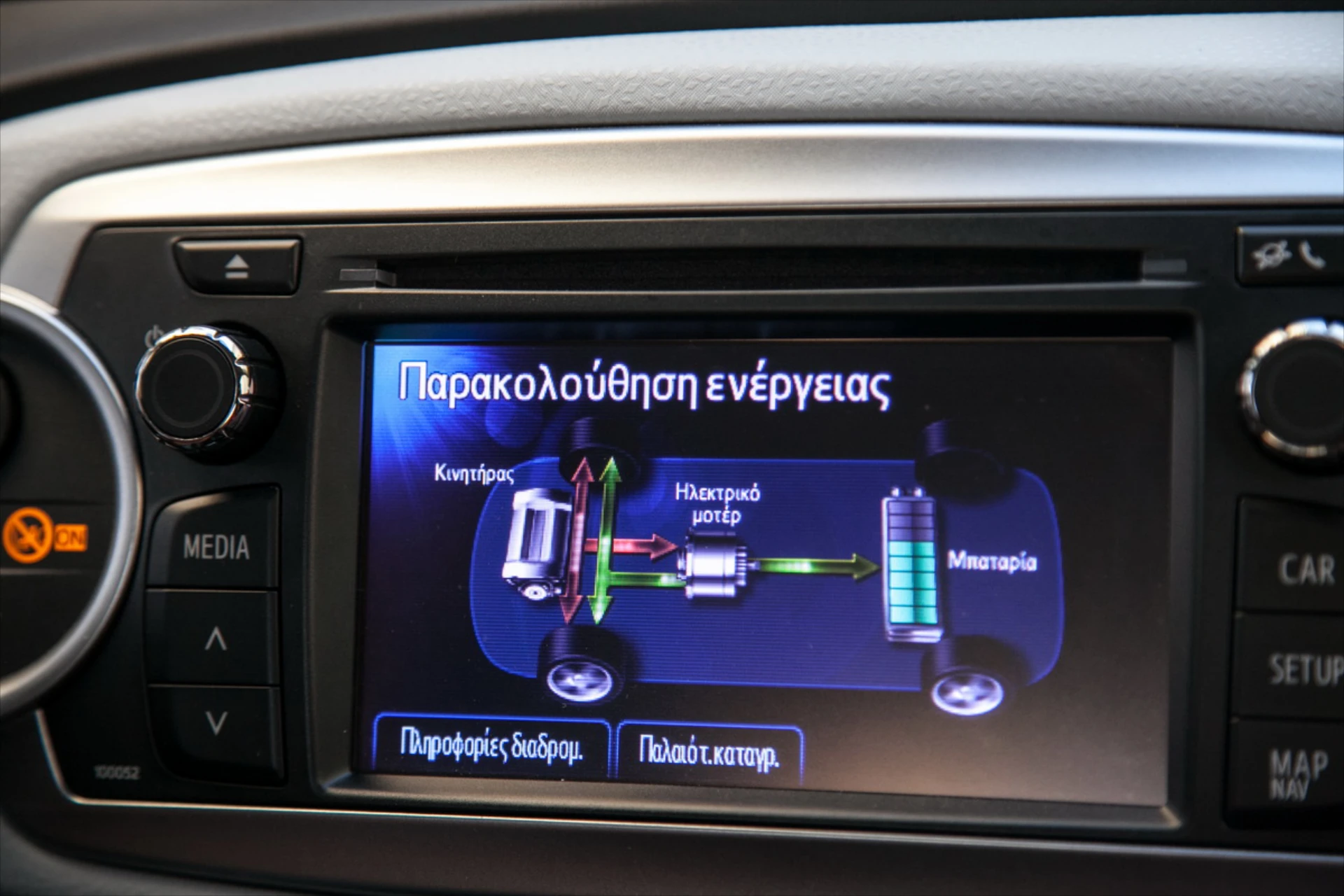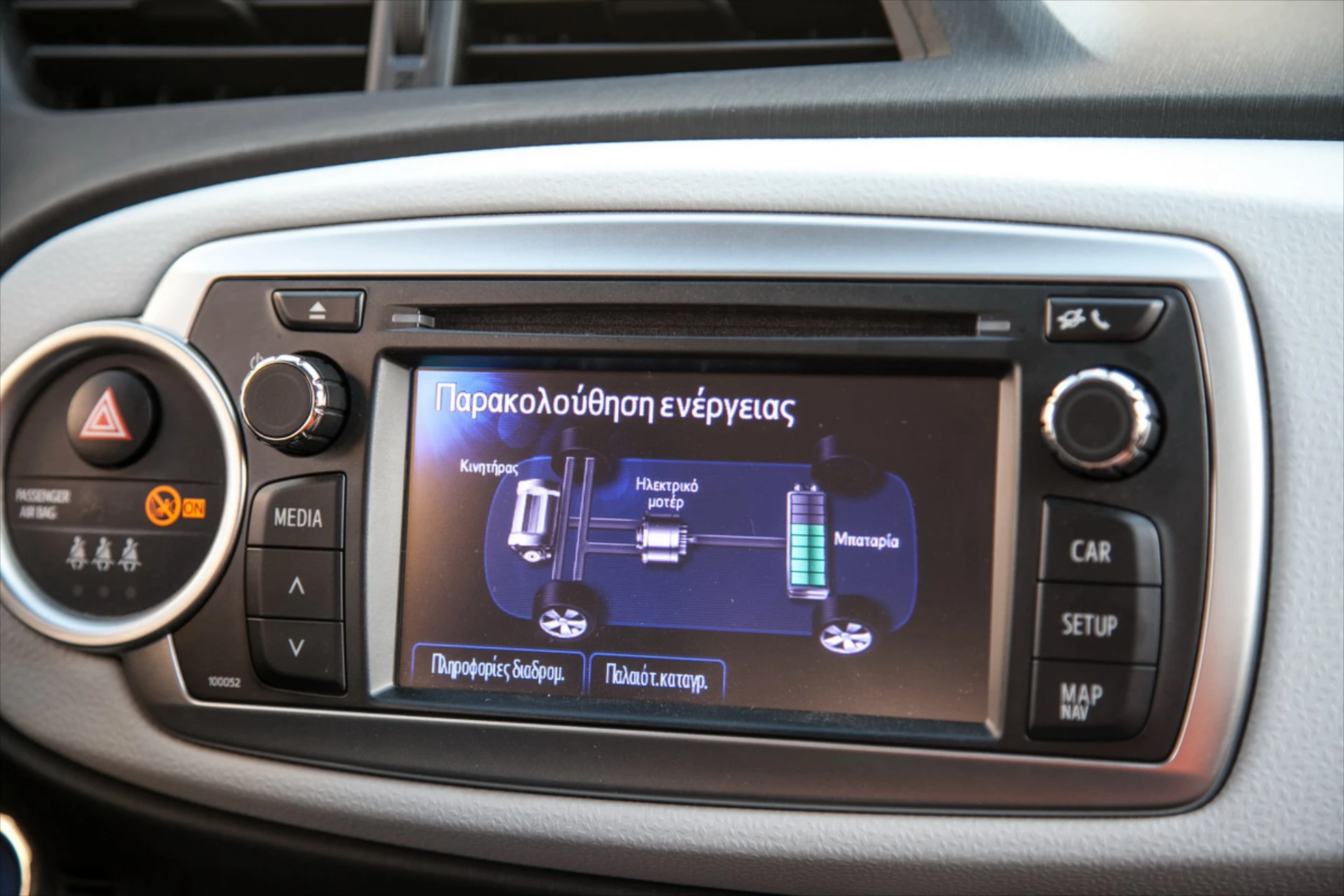 Η διαδικασία αυτή οπτικοποιείται στην οθόνη «Toyota Touch and Go» των 6,1 ιντσών που βρίσκεται στο μέσον της κονσόλας και ουσιαστικά ο οδηγός θα πιάσει τον εαυτό του να λογαριάζει συνεχώς που κερδίζει και που ξοδεύει ενέργεια. Είναι ένα ευχάριστο παιχνίδι στην αρχή όμως αρκετά επικίνδυνο καθώς ειδικά στην πόλη, είναι εύκολο να έχεις άσχημη κατάληξη και να μην σε καλύπτει η ασφάλεια.