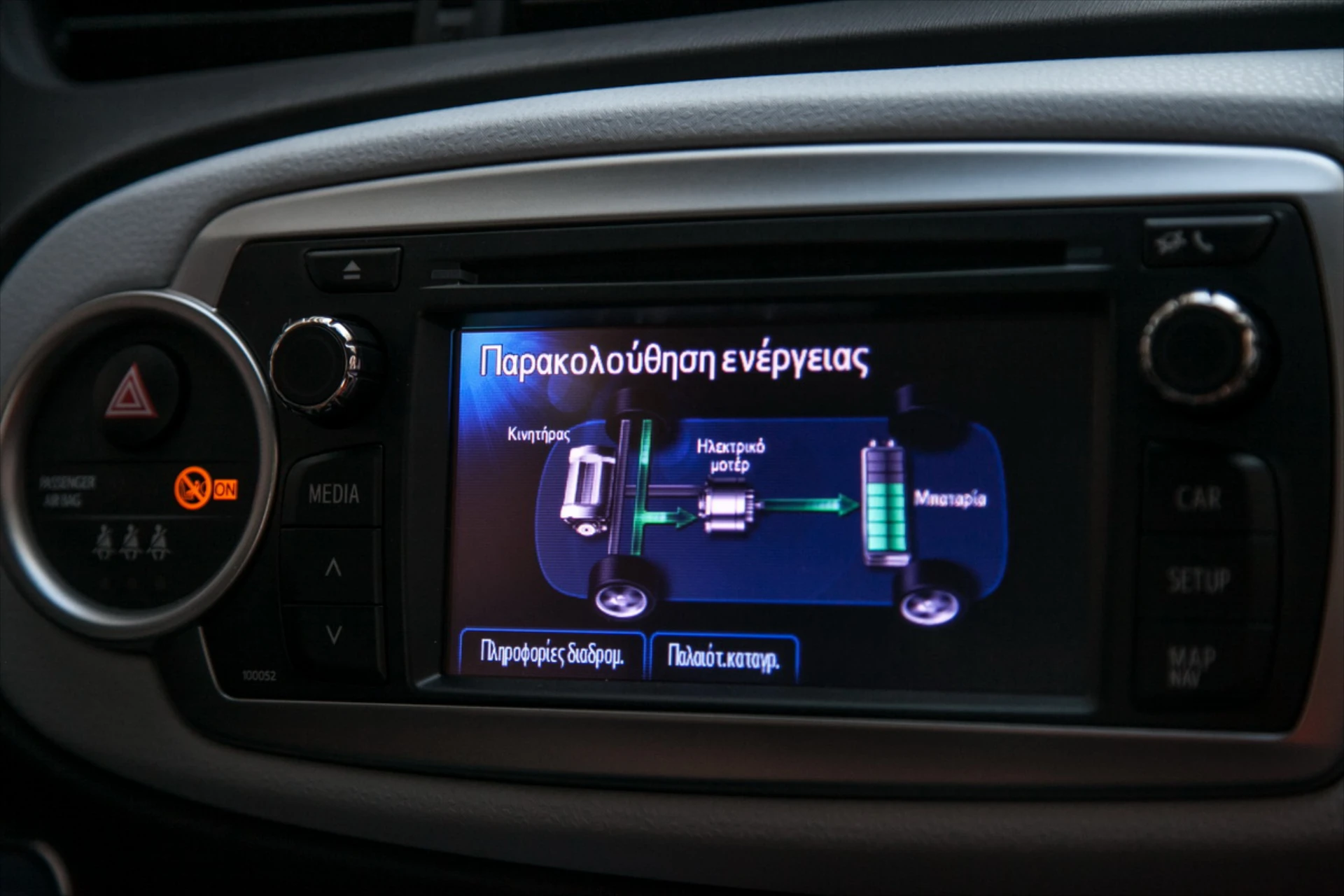 Τύφλα να ‘χει ο ΔΕΣΜΗΕ. Η παρακολούθηση της ροής της ενέργειας είναι ευχάριστο παιχνίδι, ειδικά αν βάλεις στόχο να ελαχιστοποιήσεις την κατανάλωση. To Toyota Touch βάζει το Yaris δυναμικά στην εποχή της κοινωνικής δικτύωσης. Προσφέρει ένα πλήρες σύστημα ήχου και πολυμέσων το οποίο περιλαμβάνει οθόνη 6.1’’, κάμερα οπισθοπορείας, ραδιόφωνο, CD/MP3 player, συνδεσιμότητα κινητού τηλεφώνου Bluetooth με δυνατότητα αναπαραγωγής μουσικών αρχείων και αυτόματο συγχρονισμό τηλεφωνικού καταλόγου σε κάθε σύνδεση, θύρα USB που επιτρέπει τη σύνδεση φορητών music players, με δυνατότητα απεικόνισης εξωφύλλου άλμπουμ iTunes και θύρα Aux. Παράλληλα προβάλλει ενδείξεις αυτονομίας καυσίμου, στιγμιαίας κατανάλωσης, μέσης κατανάλωσης ανά λεπτό (υπολογισμός για τα τελευταία 15 λεπτά) και χρόνου λειτουργίας του κινητήρα.