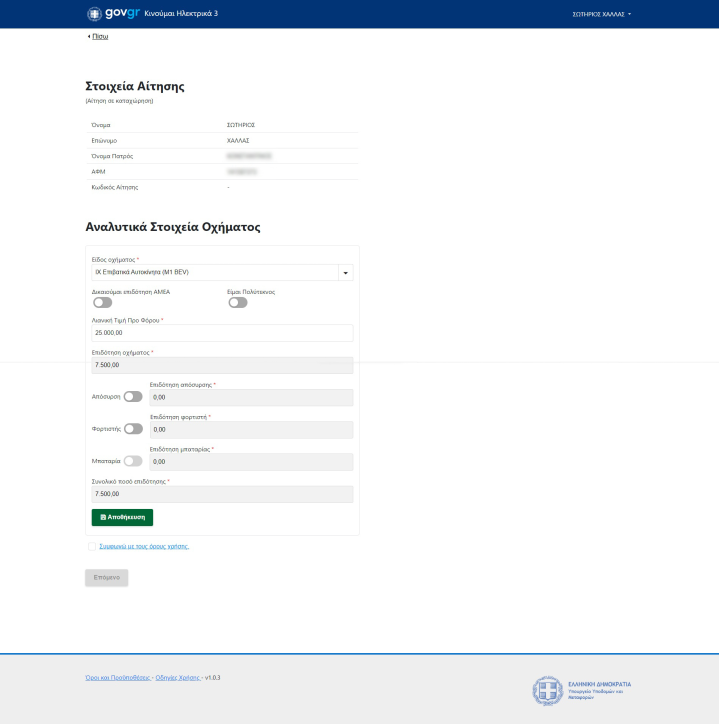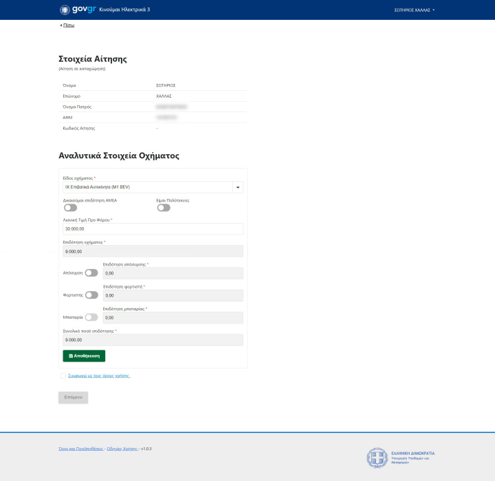 Αυτόματα το σύστημα θα υπολογίσει και θα εμφανίσει το ποσό της επιδότησης. Αν έχουμε κάνει απόσυρση πατάμε τη σχετική επιλογή, ενώ αν θέλουμε να επιδοτηθούμε και για φορτιστή θα πρέπει να το επιλέξουμε. Η τελευταία επιλογή που γράφει «Μπαταρία» αφορά τα microcars που έχουν εναλλασσόμενες μπαταρίες και την περιλαμβάνουν στον βασικό εξοπλισμό.